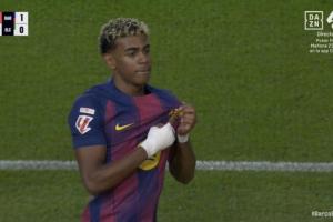 改变来了?亚马尔一改此前“加冕”方式,进球后亮队徽和队友庆祝